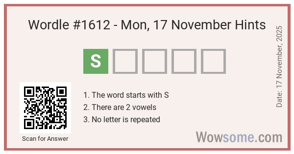 Wordle is an addictive vocabulary game which has won hearts of everyone. Some of the Wordles are not easy to solve. If you are stuck in the game, then we have some hints for you. Today we will discuss the vocabulary puzzle Wordle #1612 of Monday, 17th November 2025.