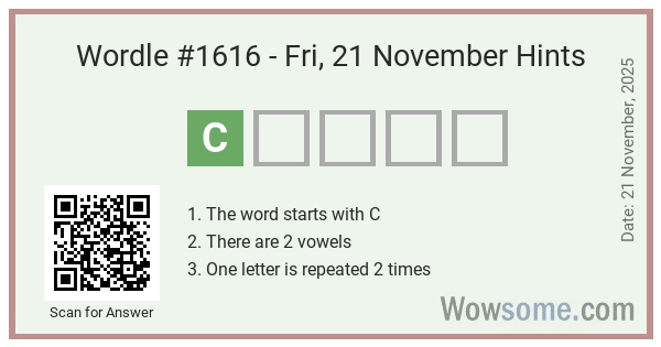 Wordle is a famous game about guessing word played by millions around the globe. Few Wordles are hard to crack. If you are facing difficulty, then we have some hints for you. Today we will discuss the vocabulary puzzle Wordle #1616 of Friday, 21st November 2025.