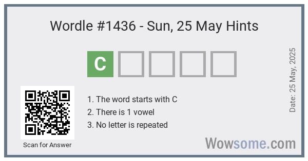 Wordle is an addictive vocabulary game played by millions around the globe. Few Wordles are hard to crack. If you can not solve it, then this page is for you only. Let us try to solve the Wordle #1436 of Sunday, 25th May 2025.